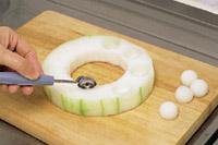 在 瓜 肉 上 挖 小 孔 。 甘 筍 去 皮 切 片 , 蝦 米 洗 淨 , 放 入 冬 瓜 中 央 , 瑤 柱 放 入 小 孔 , 再 在 瑤 柱 面 放 上 冬 瓜 粒 。