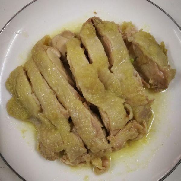 超級簡單方便的薑汁蒸雞,雞汁伴飯吃有點像海南雞的雞油飯一樣好味!材料:去骨雞腿 1隻蔥 2根姜 1大塊紅蔥頭 4粒調味料:鹽 適量胡椒粉 1茶匙米酒 半杯蓋香油 適量做法:1) 蔥切段、姜切片、紅蔥頭切片備用。2) 將(1) 放入攪拌器略打碎成茸,加入調味料拌勻3)