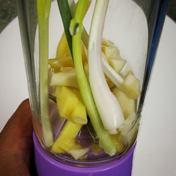 1) 蔥切段、姜切片、紅蔥頭切片備用。
