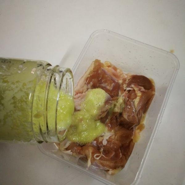 3) 將去骨雞腿放入容器,倒入(2)拌勻雞腿底及面,待20~30分鐘入味。