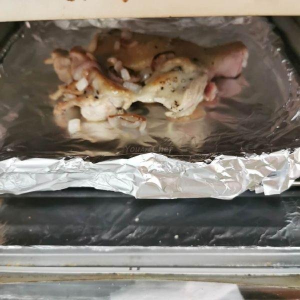 用中火起油鑊,將雞髀有皮一面向下煎大概兩分鐘至雞皮轉成金黃色,將雞髀盛在焗盤/碟上,放入180度焗爐焗大概15分鐘。