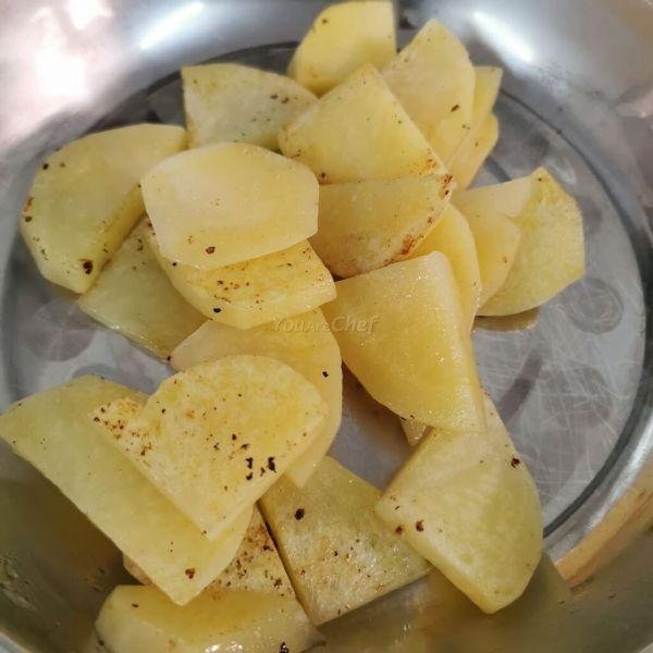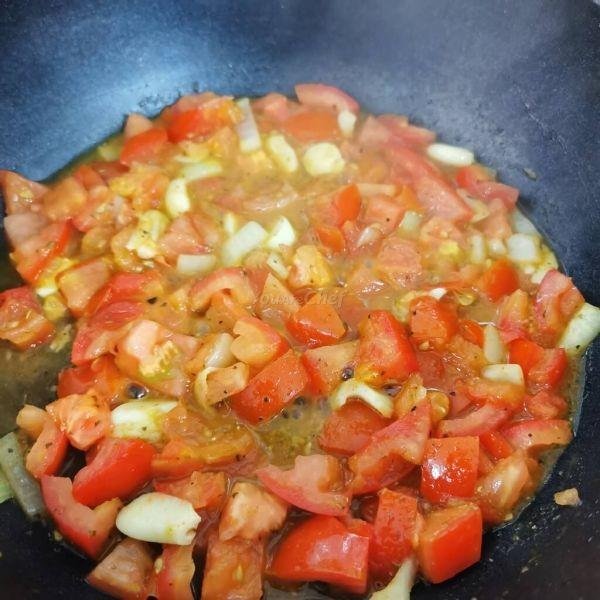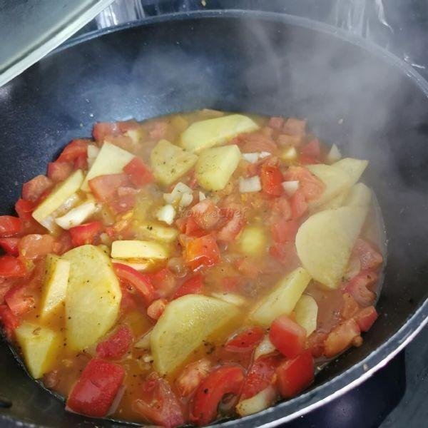 熱油鑊,下蒜片爆香,加入蕃茄略炒,加蓋焗煮一分鐘,加入熱滾水,再最加蓋 3分鐘; 加入薯片用中小火炆煮8-10分鐘。
