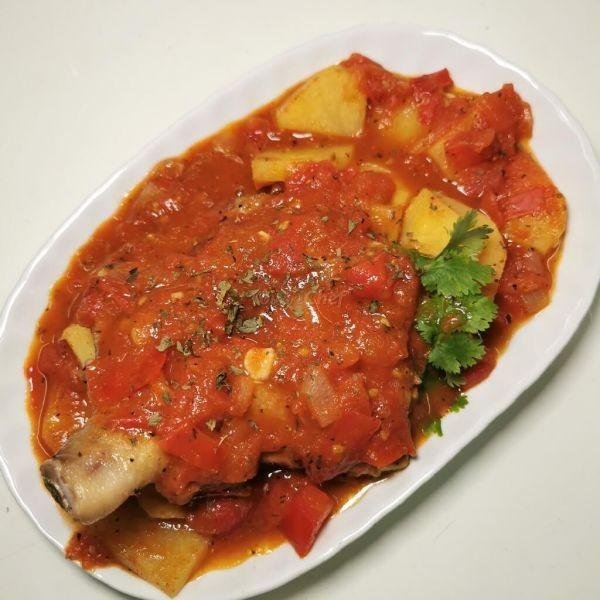 在焗雞髀之同時間,蕃茄薯仔汁亦已煮好,將雞髀從焗爐取出放盤的一邊,蕃茄薯仔汁放另一邊便可享用。喜歡可將蕃茄汁淋在雞髀上面。焗好的雞髀可以全髀上碟,亦可斬件上。