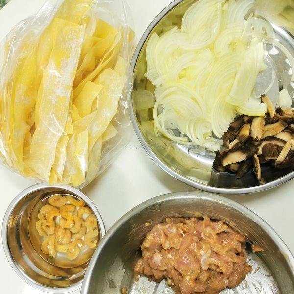 1) 用一隻洋蔥切薄片/絲,餚蝦米冬菇湯半小時