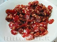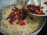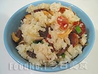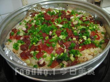 - 將臘腸及蔥粒與已蒸熟的糯米飯混合,再蒸約5分鐘,即成;