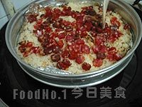 將臘腸及蔥粒混入已蒸熟的糯米飯,再蒸約5分鐘。