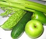 - 將蘋果、青瓜、青椒、苦瓜和苦瓜清洗、去皮(只是青瓜)及去种子(苦瓜、蘋果 及青椒。
