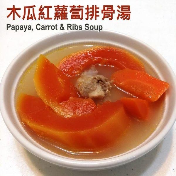 木瓜排骨湯內放一支紅蘿蔔可增加湯的清甜味道和營養價值份量: 3 人份 / 時間: 30 分鐘材料: 木瓜 1 個 (最好用青木瓜)排骨 適量紅蘿蔔 1條薑片 3~4片米酒 1大匙水 1.5公升調 味:鹽 適量