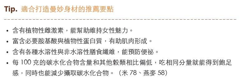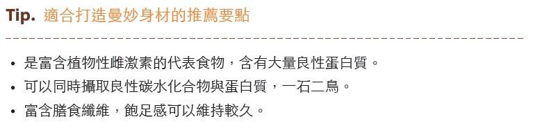 如果是沒有特殊疾病的成人,會建議配合體重攝取適量的蛋白質,每一公斤所需攝取的量是0.8∼1克。每餐菜單都要放入蛋白質,以達到適合自己體重的建議攝取量。要吃脂肪少的瘦肉、海鮮,才能夠減少攝取飽和脂肪酸。絕對不可以用攝取蛋白質當藉口,大量吃進脂肪含量高的肉。特別是黃豆、小扁豆這類內含女性荷爾蒙的植物性蛋白質,對於打造曼妙身材更有幫助。穀物中的植物性蛋白質,缺少部分人體所需的必要胺基酸,可以搭配低脂牛奶一起喝以補足缺少的營養。