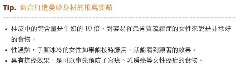 桂皮中豐富的鉀,可以促進排出體內的鈉,對手腳冰冷、容易水腫的女性來說,是種不僅能夠幫助減肥,更對健康有益的食物。不過如果是孕婦或是體質燥熱的人,建議還是跟中醫師諮詢之後再食用。