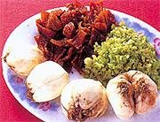 - 鮮 百 合 切 去 近 根 部 分 , 撕 開 成 片 , 然 後 浸 洗 乾 淨 ; 中 芹 去 腳 和 去 葉 , 留 下 中 芹 莖 拍 扁 後 再 切 成 末 ; 大 地 魚 撕 出 魚 肉 , 在 乾 鑊 中 煨 香 後 攤 涼 , 再 拍 剁 成 地 魚 末 。