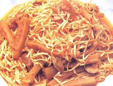 油 炸 伊 麵 3 件 茄 子 6 兩 江 瑤 柱 1 兩 蒜 頭 4 粒 材料一覽 鹽 1/2 茶 匙 豆 瓣 辣 椒 醬 1 湯 匙 糖 1 茶 匙 湯 1 杯 江 瑤 柱 浸 透 後 先 燉