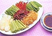 海 蜇 洗 淨 切 絲 , 用 蟹 眼 水 灼 至 收 縮 , 放 在 水 喉 下 , 慢 水 啤 至 發 脹 。 中 芹 、 西 芹 洗 淨 切 絲 ; 馬 蹄 切 片 , 荷 豆 去 絲 。 牛 肉 切 絲 , 用 生 粉 水 略 醃 。