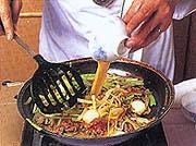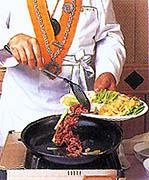 燒 熱 油 , 放 入 牛 肉 浸 至 八 成 熟 , 取 出 , 傾 去 過 多 的 油 分 。 原 鑊 炒 香 中 西 芹 。 再 加 入 馬 蹄 片 和 荷 豆 一 起 兜 炒 。