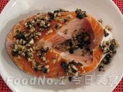 將所有爆香料盛入三文魚扒,放進蒸籠蒸5分鐘即可