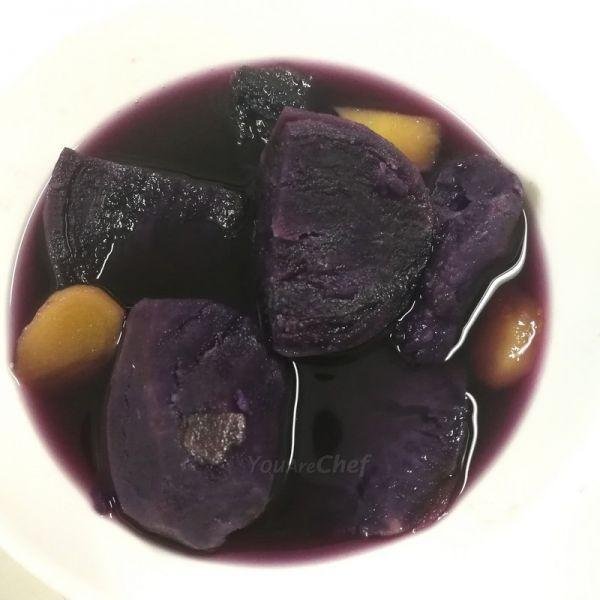 - 在凍開水入煲佈,水滾加入紫番薯及薑,蓋上煲蓋大火煲5分鐘,轉小火煲10分鐘左右至紫番薯稔身;