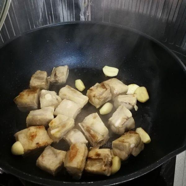 3) 下排骨煎香外層有少許金黃色後,