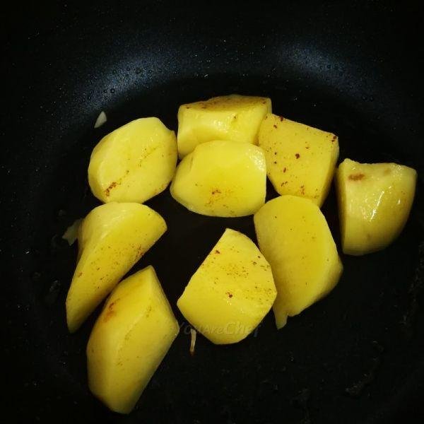 4) 下薯仔煎香外層 (薯仔在煮時不易散開),