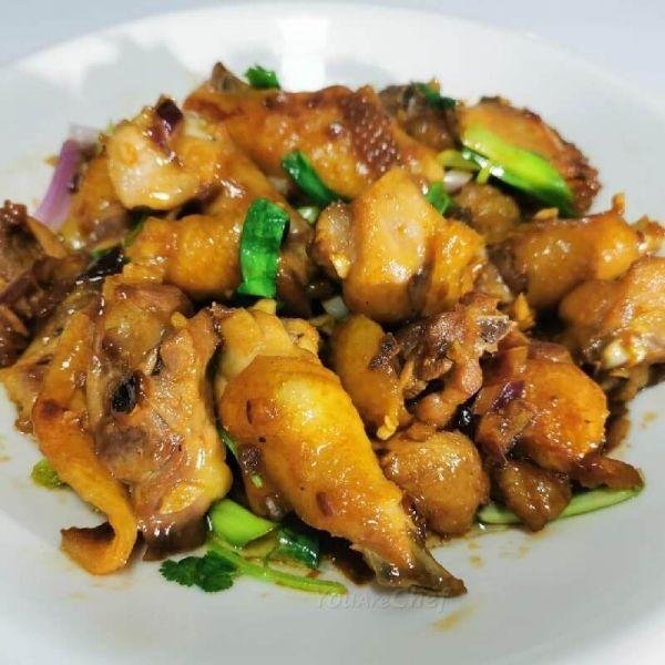 - 翻炒至兩面金黃,加入香菜、蔥段,用適量生粉水勾芡即可!
