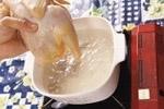 3 ) 雞 切 乾 淨 先 出 水 , 再 與 瘦 肉 、 薑 片 、 蔥 條 放 入 煲 中 煲 滾 後 改 用 中 火 煮 2 小 時 , 落 鹽 即 成 。