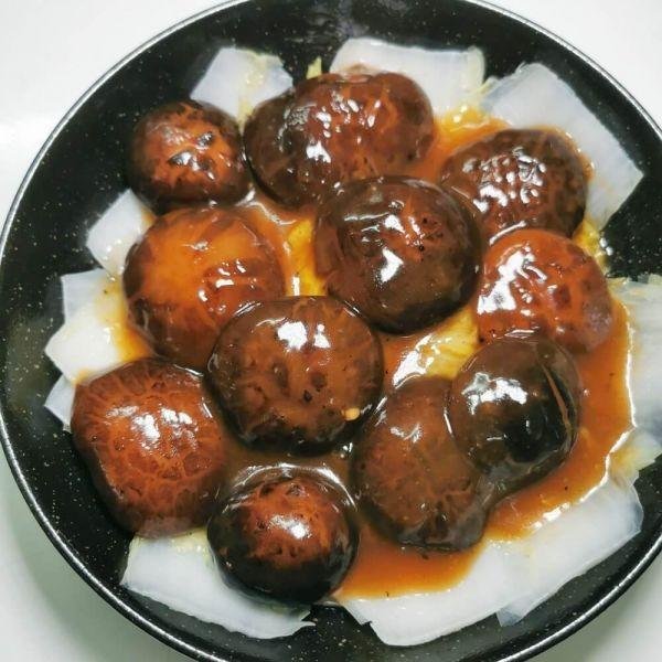用中慢火, 爆香蒜片,放入冬菇,加米酒,炒至乾身, 加入200毫升水,豉油,少許(1/2茶匙)老抽, 鹽,糖 胡椒粉,一湯匙蠔油, 慢火煨20分鐘,焗15分鐘。 食嘅時間翻熱,埋濃芡成濃汁後, 淋在紹菜面。
