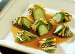 最後將備好的材料和辣椒絲均勻地填充進黃瓜塊背部的切口中。