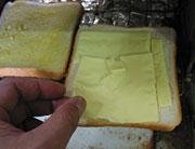 - 反轉其一麵包並放上芝士,將另一塊麵包放在芝士面的另一麵屯包 上 **芝士是放在沒有牛油的兩塊麵包中間 **
